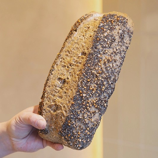 Pan de masa madre con una mezcla de semillas de chía, amapola, lino marrón y trigo sarraceno en su interior y rebozado en la misma mezcla para dar un toque extra crujiente a la corteza